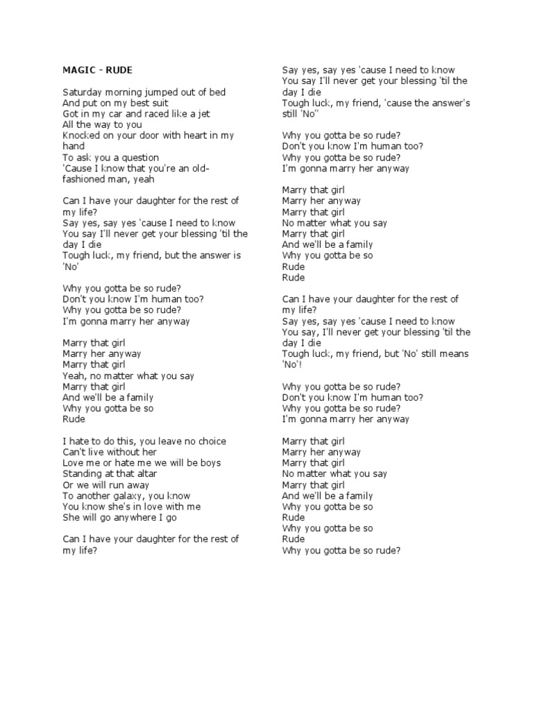 Song Lyrics With Guitar Chords For Magic What does magic!'s song rude mean?